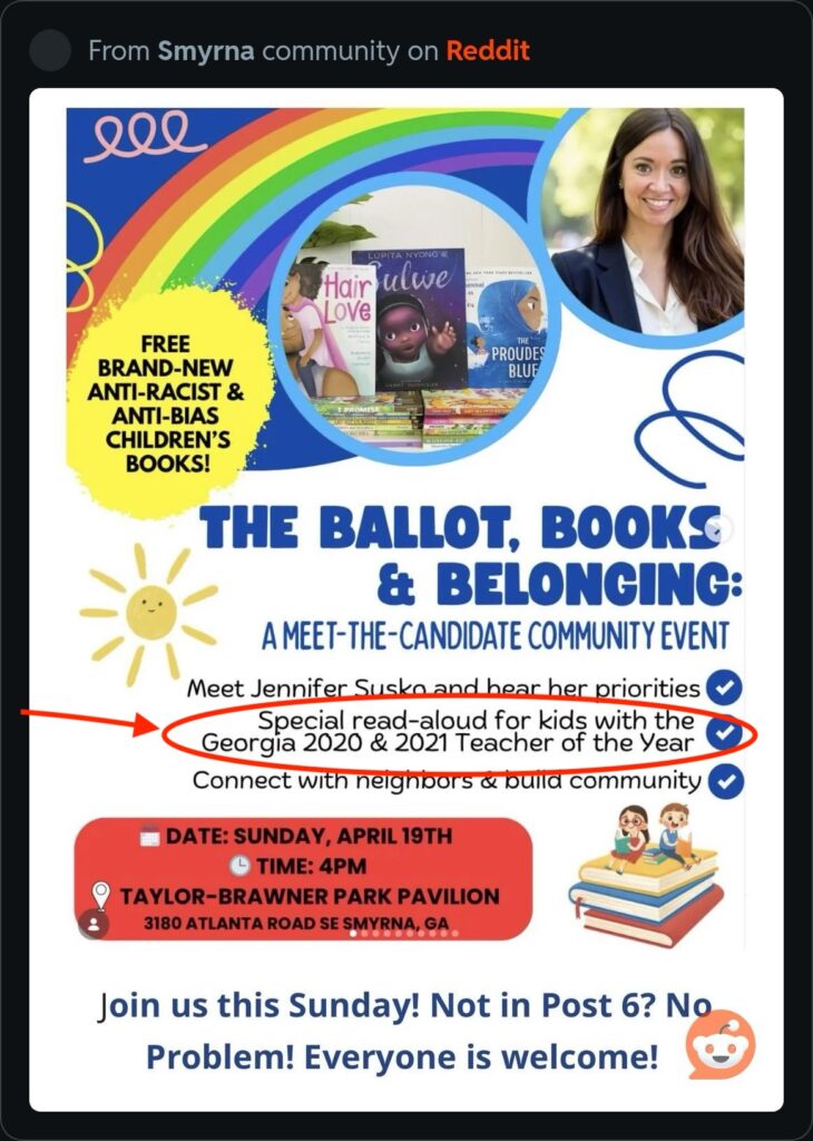 Susko, a former Cobb County school counselor, is featured in a Reddit a post that states “Meet Jennifer Susko and hear her priorities, Special read-aloud for kids with Georgia 2020 & 2021 Teacher of the year, connect with neighbors & build community.” the post clearly implies that Susko is a former teacher of the year and will be reading to children at the event.